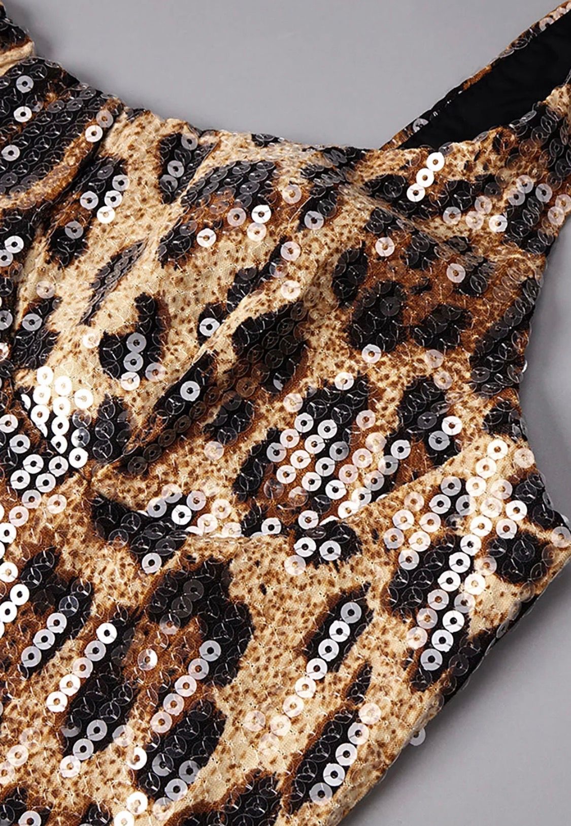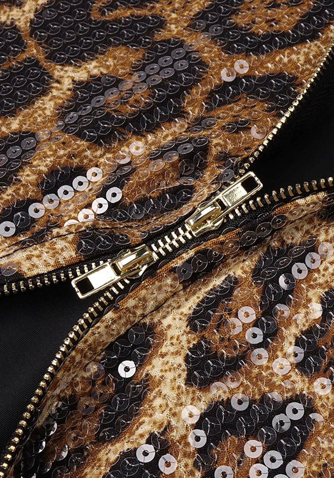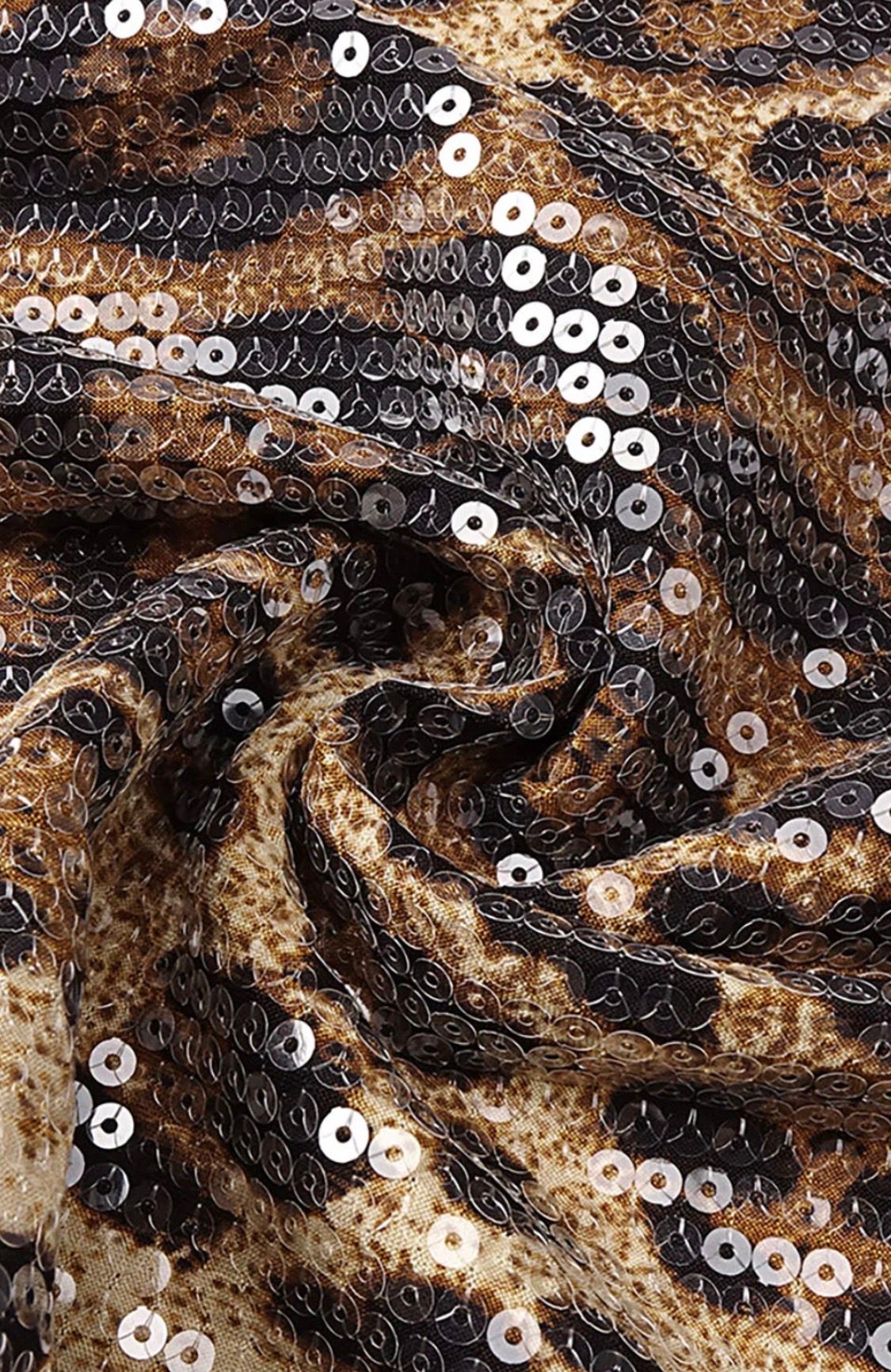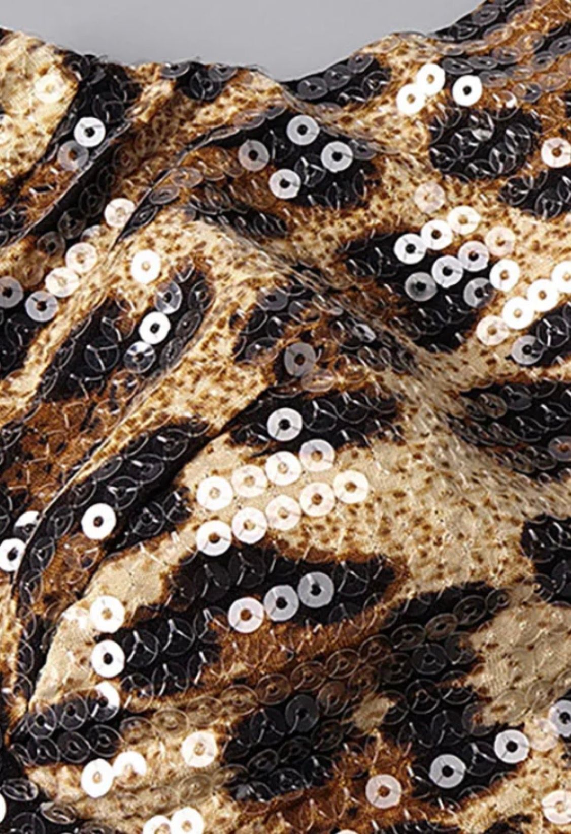 La base de estampado felino cobra vida bajo una red de lentejuelas transparentes.