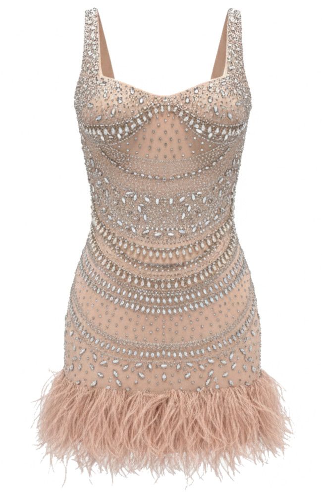 Vestido corto elástico nude con pedrería y plumas