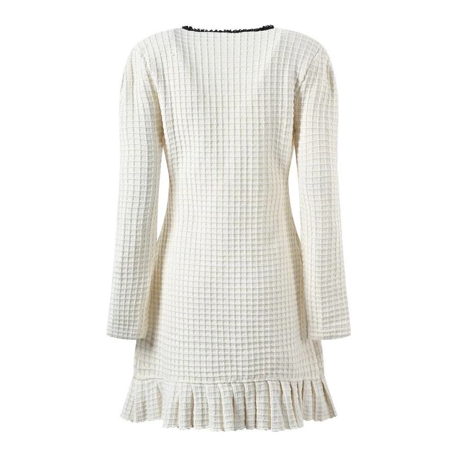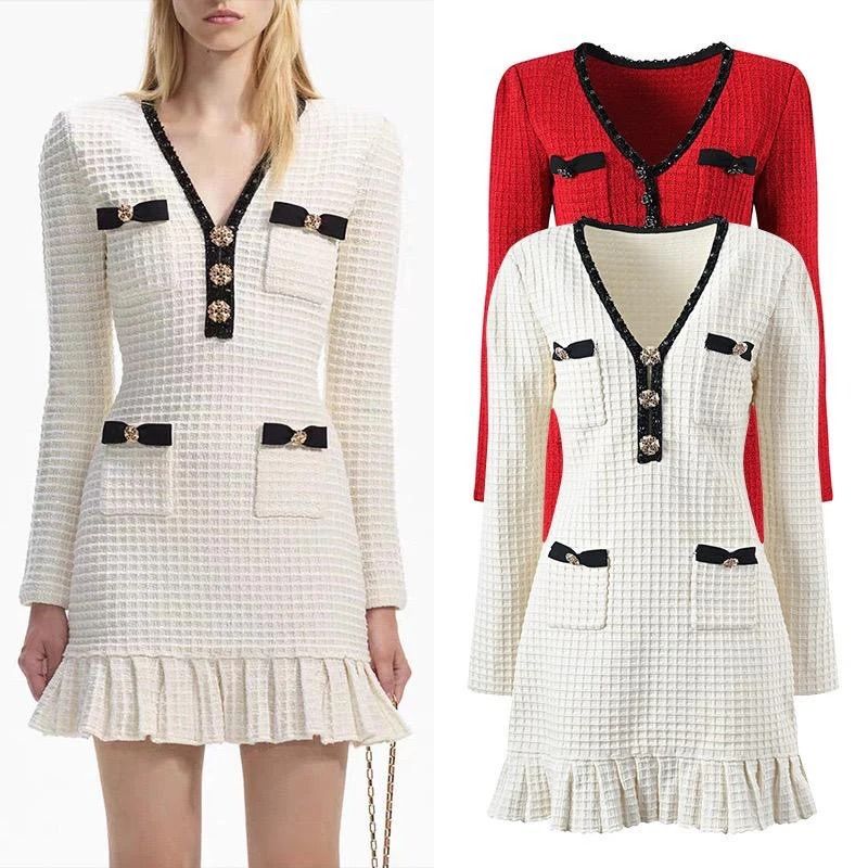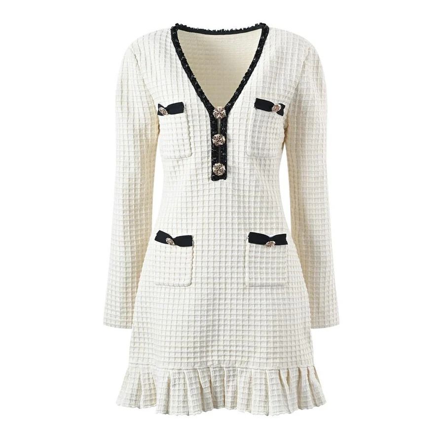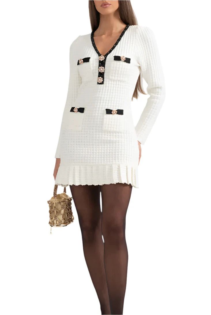 Vestido elástico corto de punto de manga larga en color blanco y negro con detalles de botones de pedrería