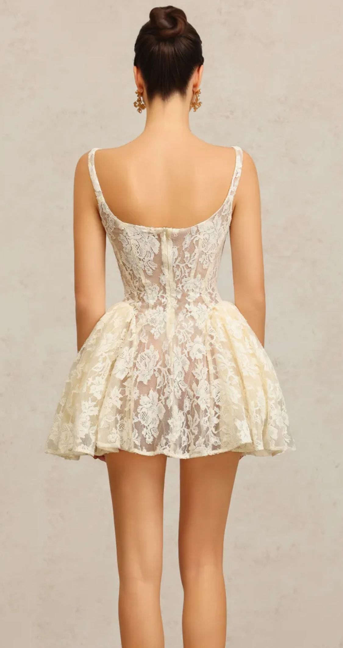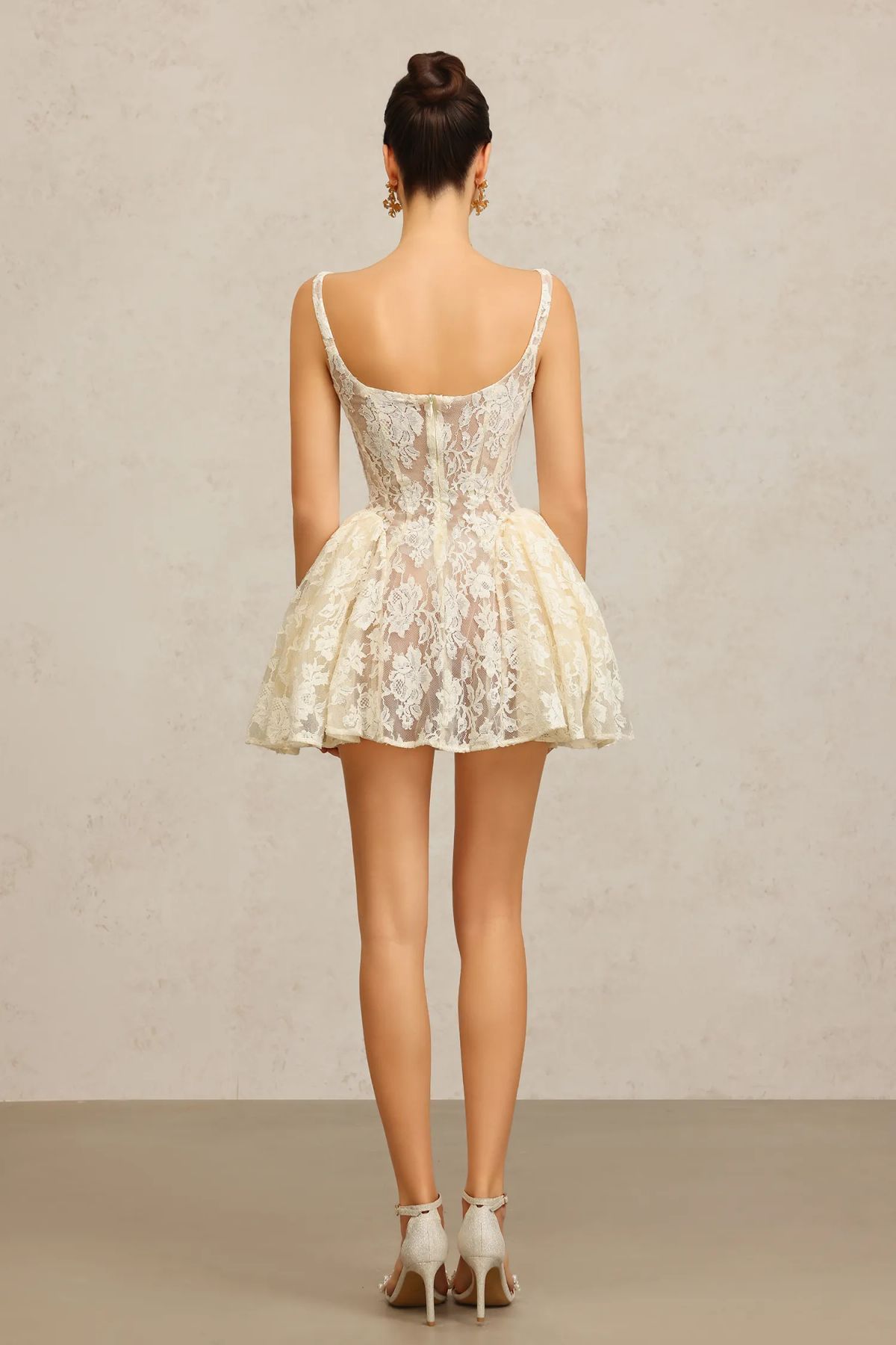 Vestido corto de corte evasé en color blanco marfil de encaje