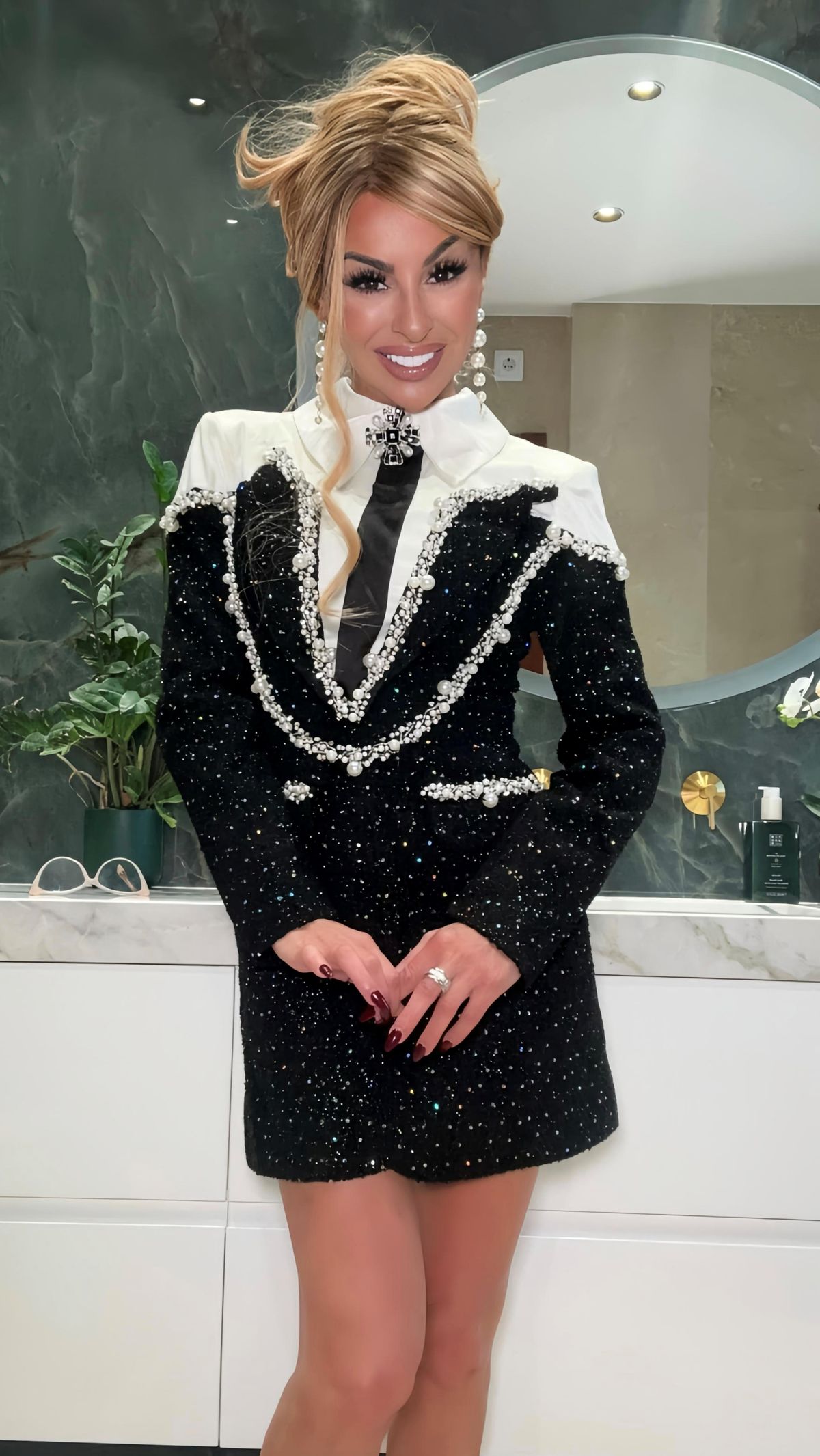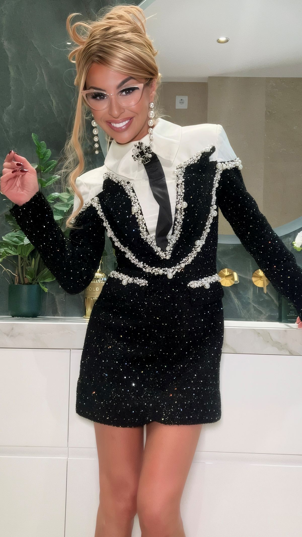 Vestido tipo sastre de tejido tweed corto de manga larga blanco y negro con pedrería