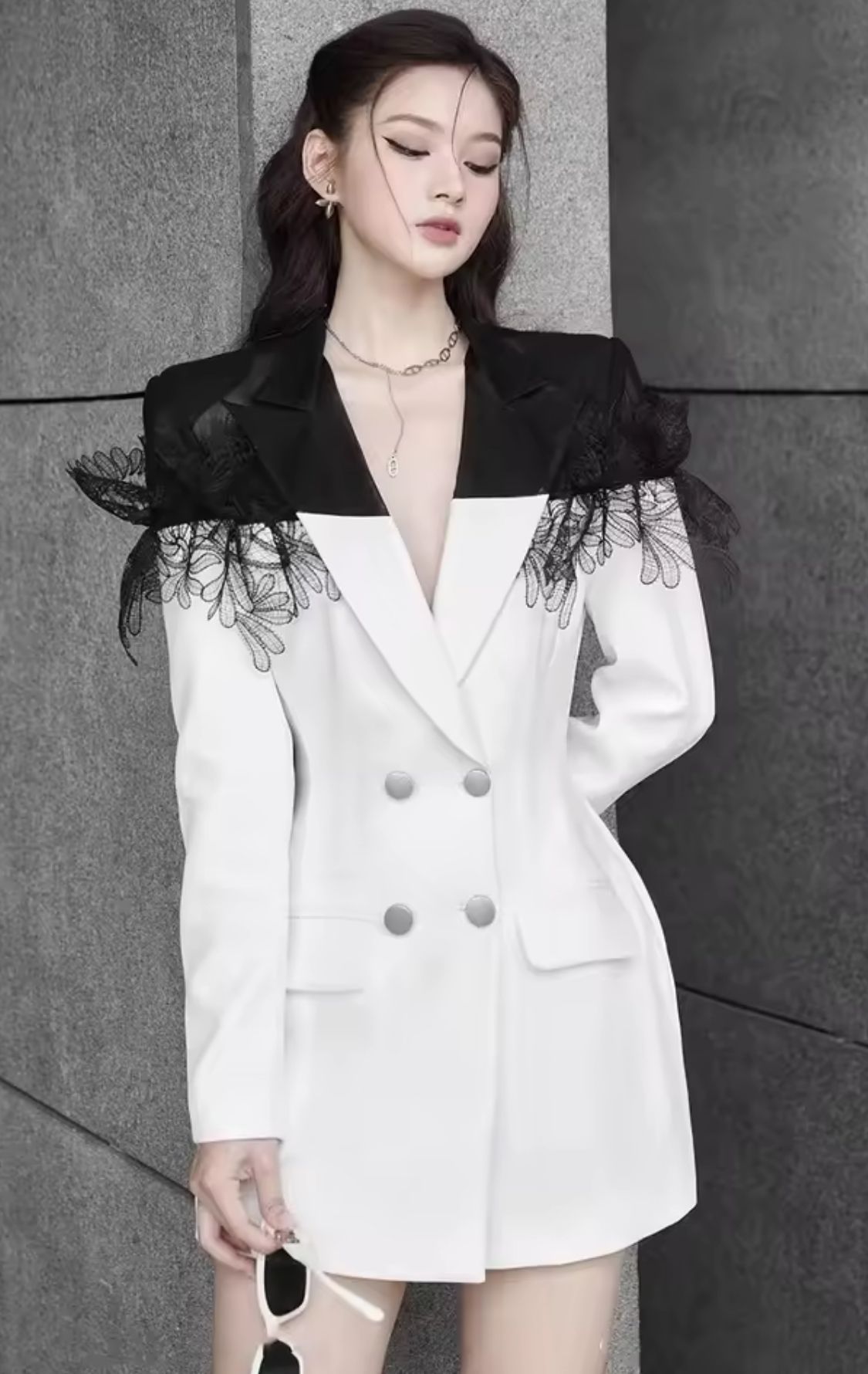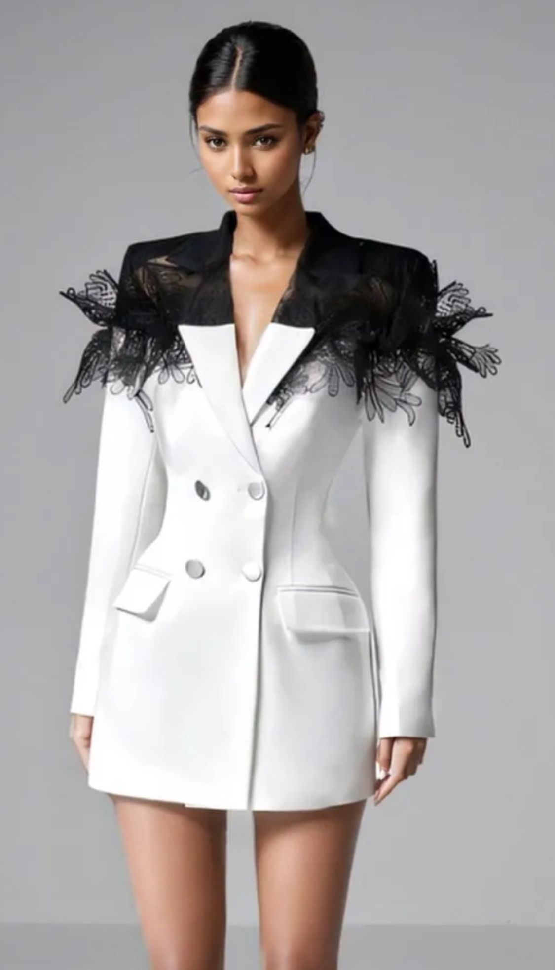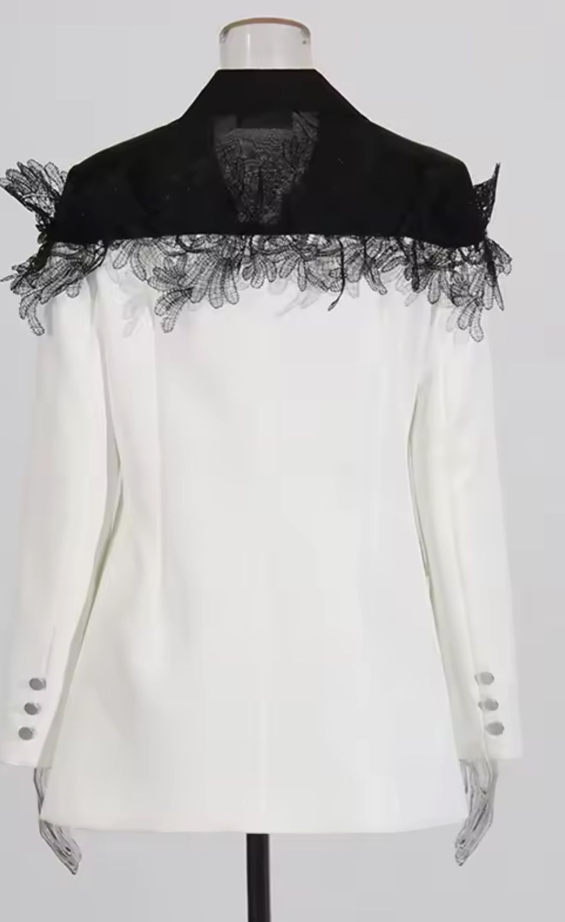 Vestido tipo americana blanco y negro con encaje en hombros