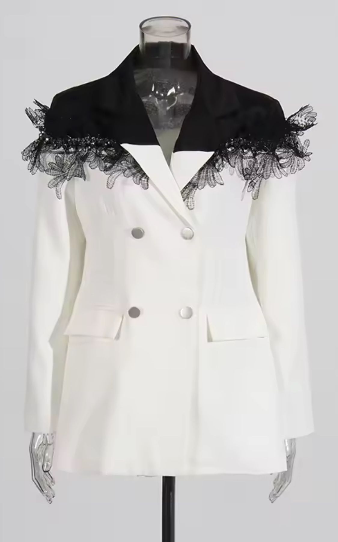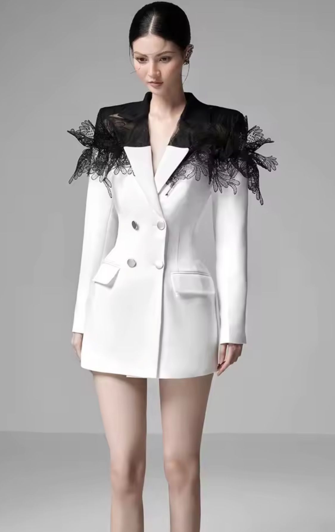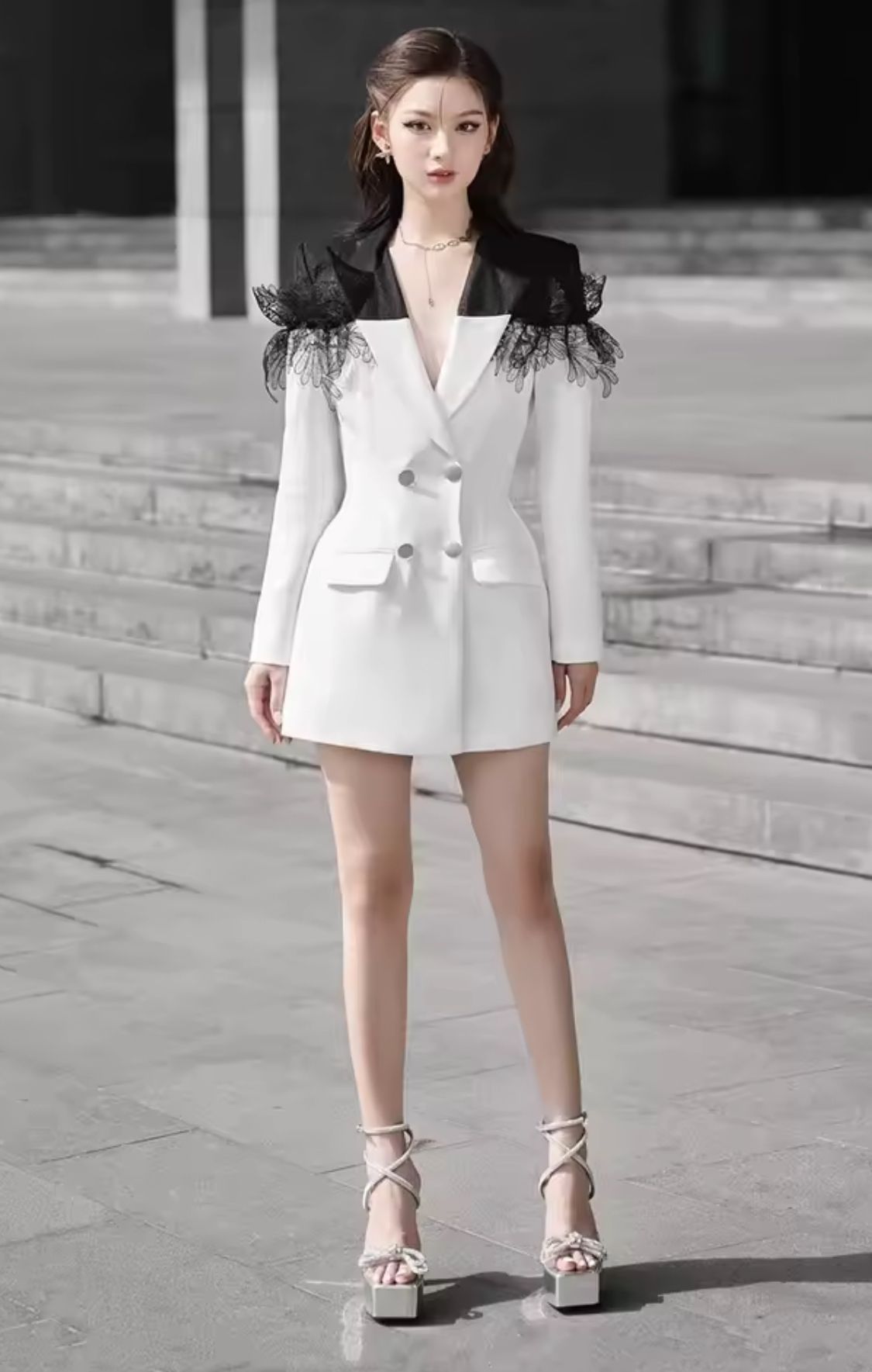 Vestido tipo americana blanco y negro con encaje en hombros
