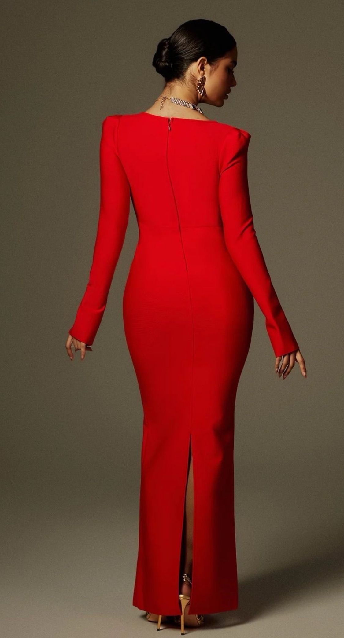 Vestido largo elástico de tejido bandage de manga larga con escote decorado con flor en color rojo
