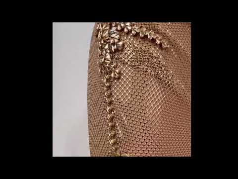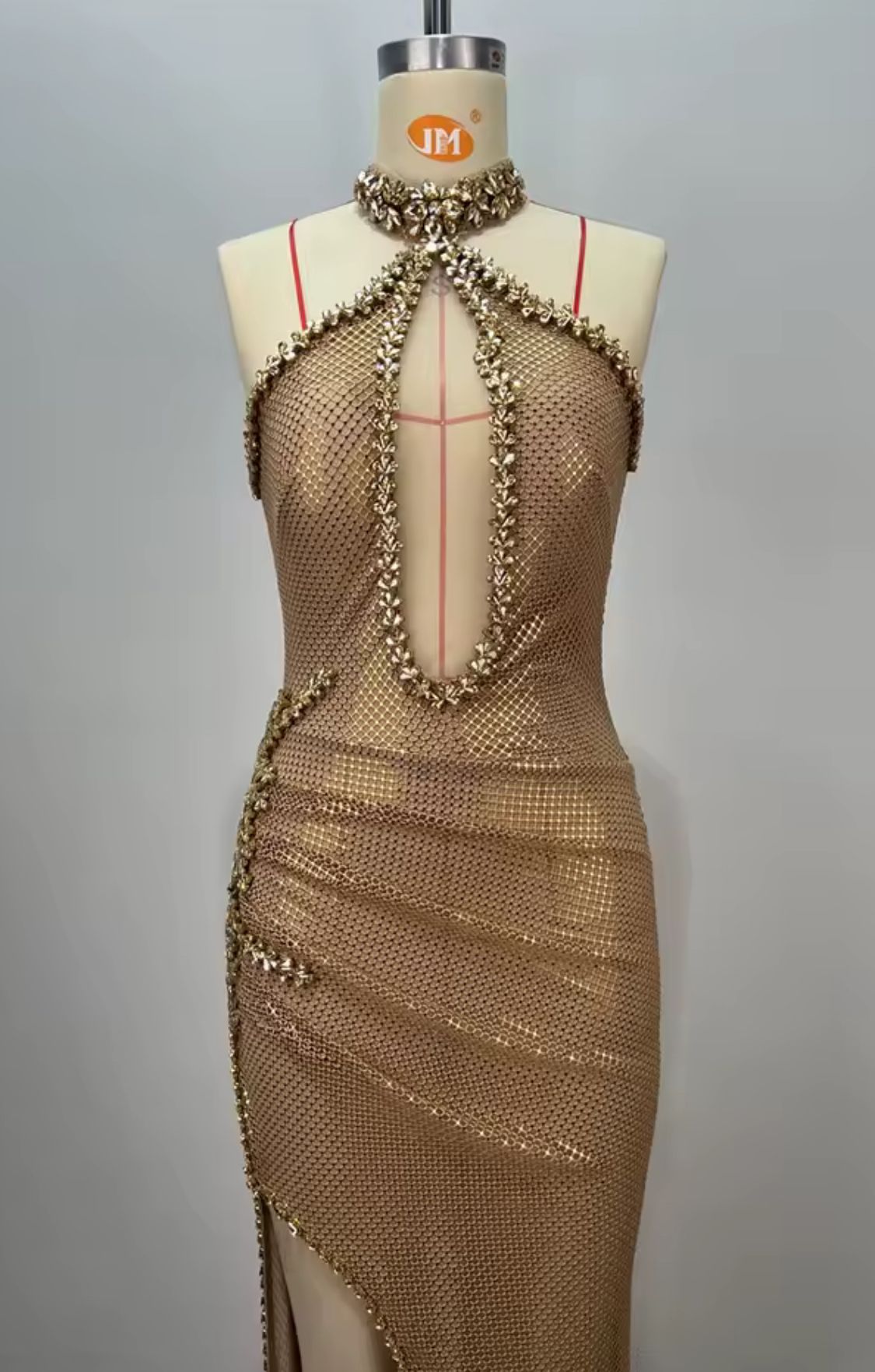 Se trata de un vestido de gala de malla dorada que se adapta como un guante a tu cuerpo.