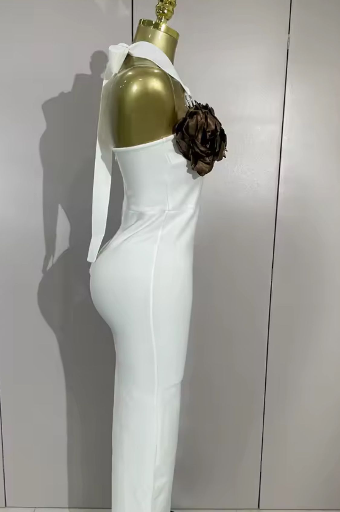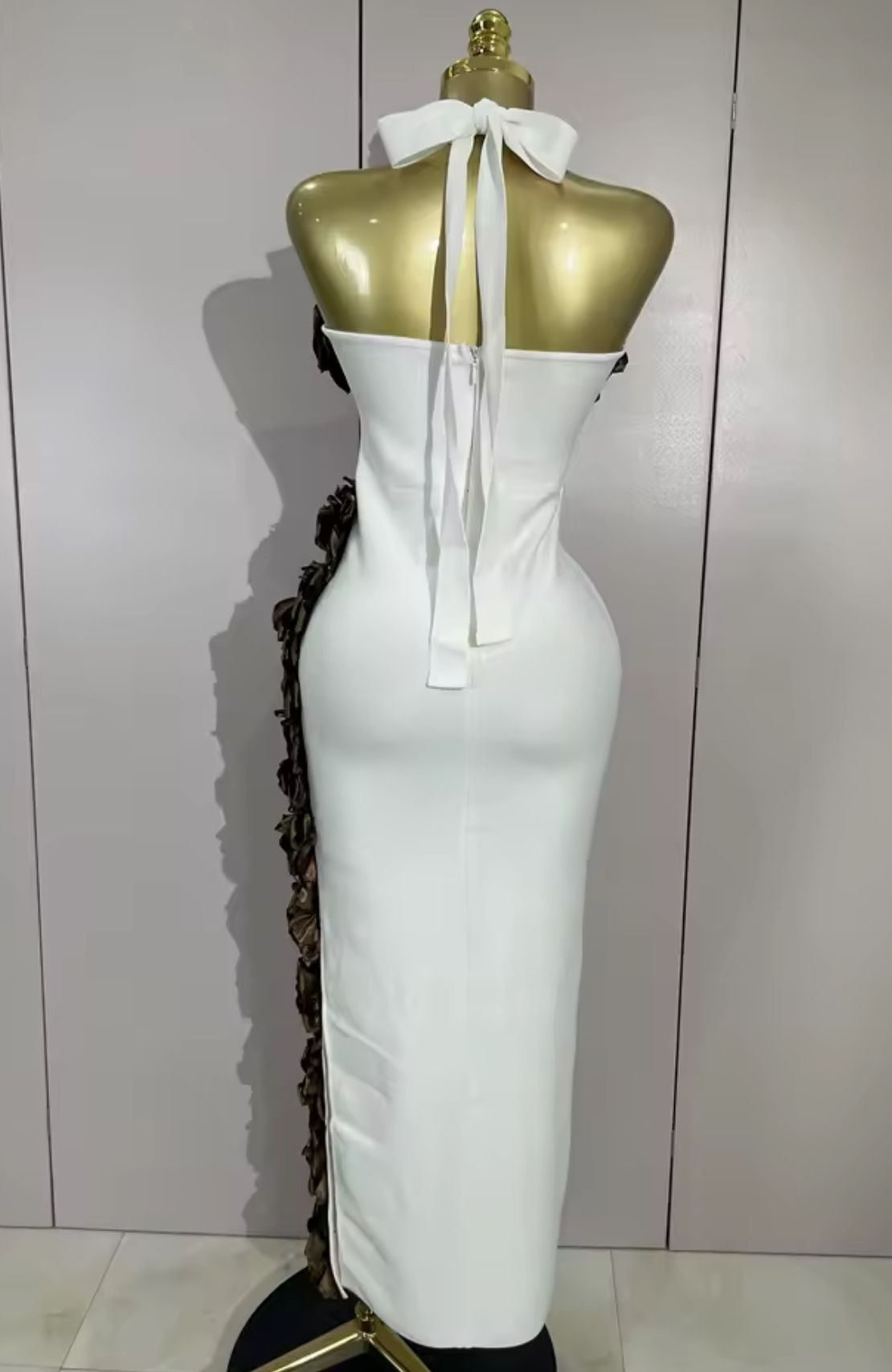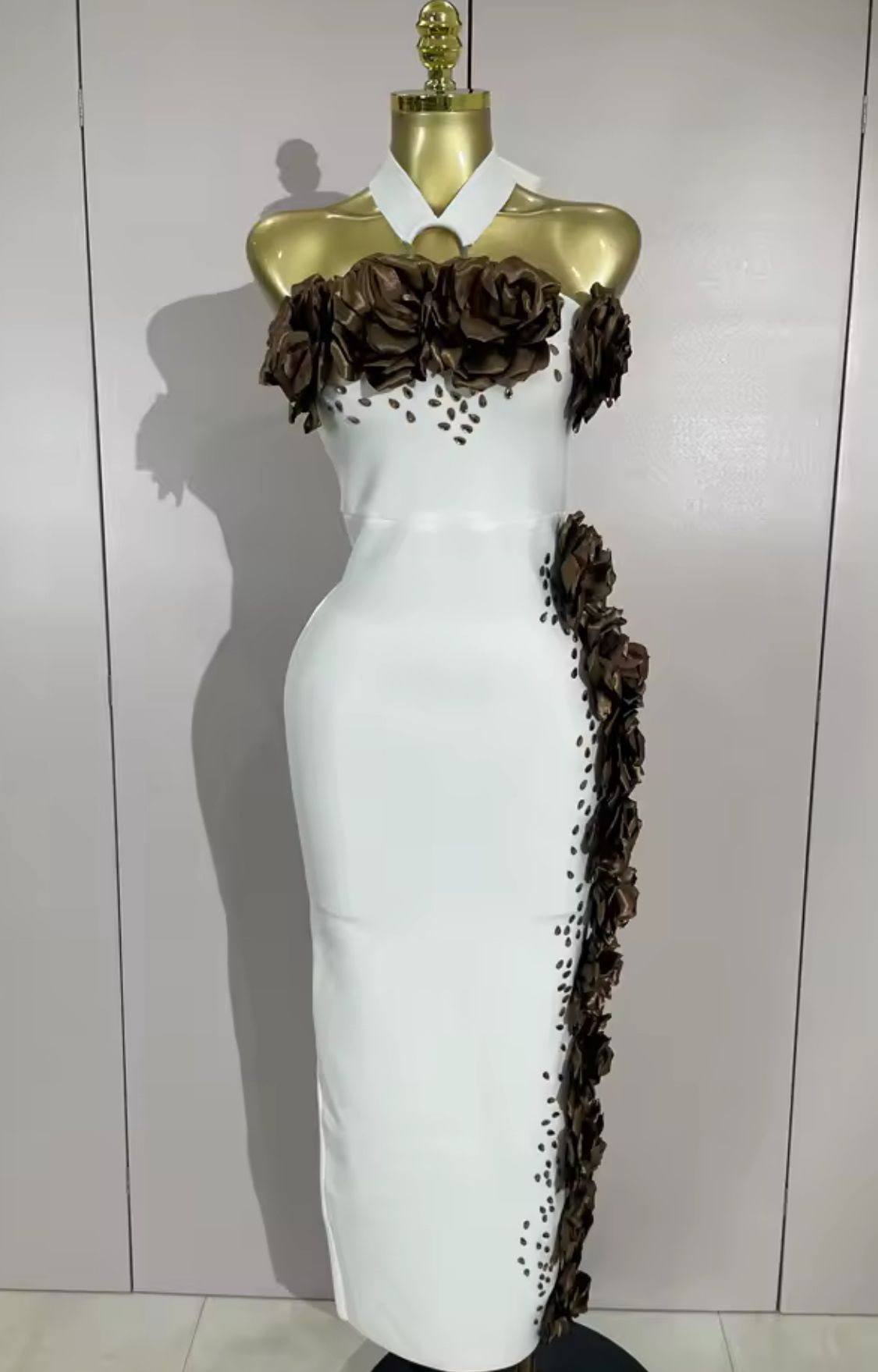 Vestido elástico bandage blanco de corte midi con flores decorativas en marrón