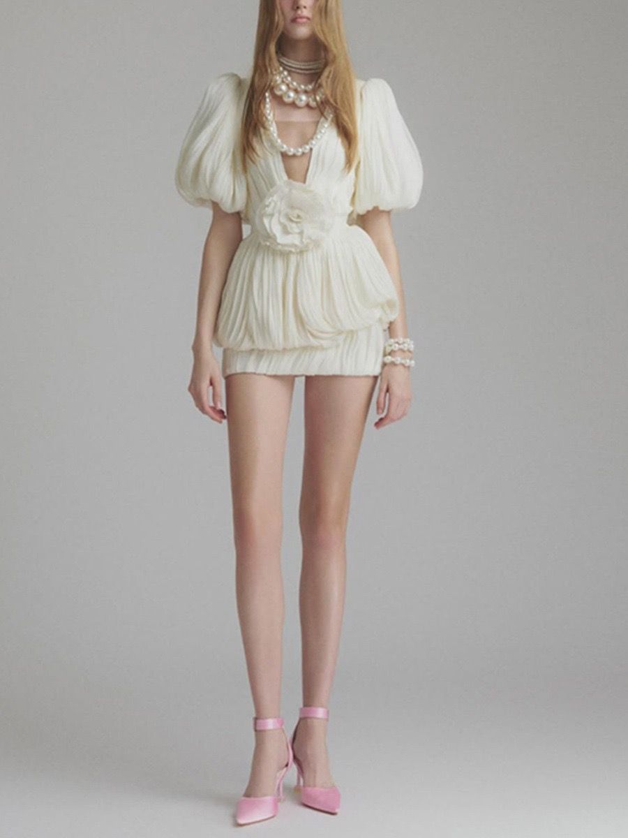 Vestido corto fruncido en blanco marfil de manga corta con flor decorativa en cintura