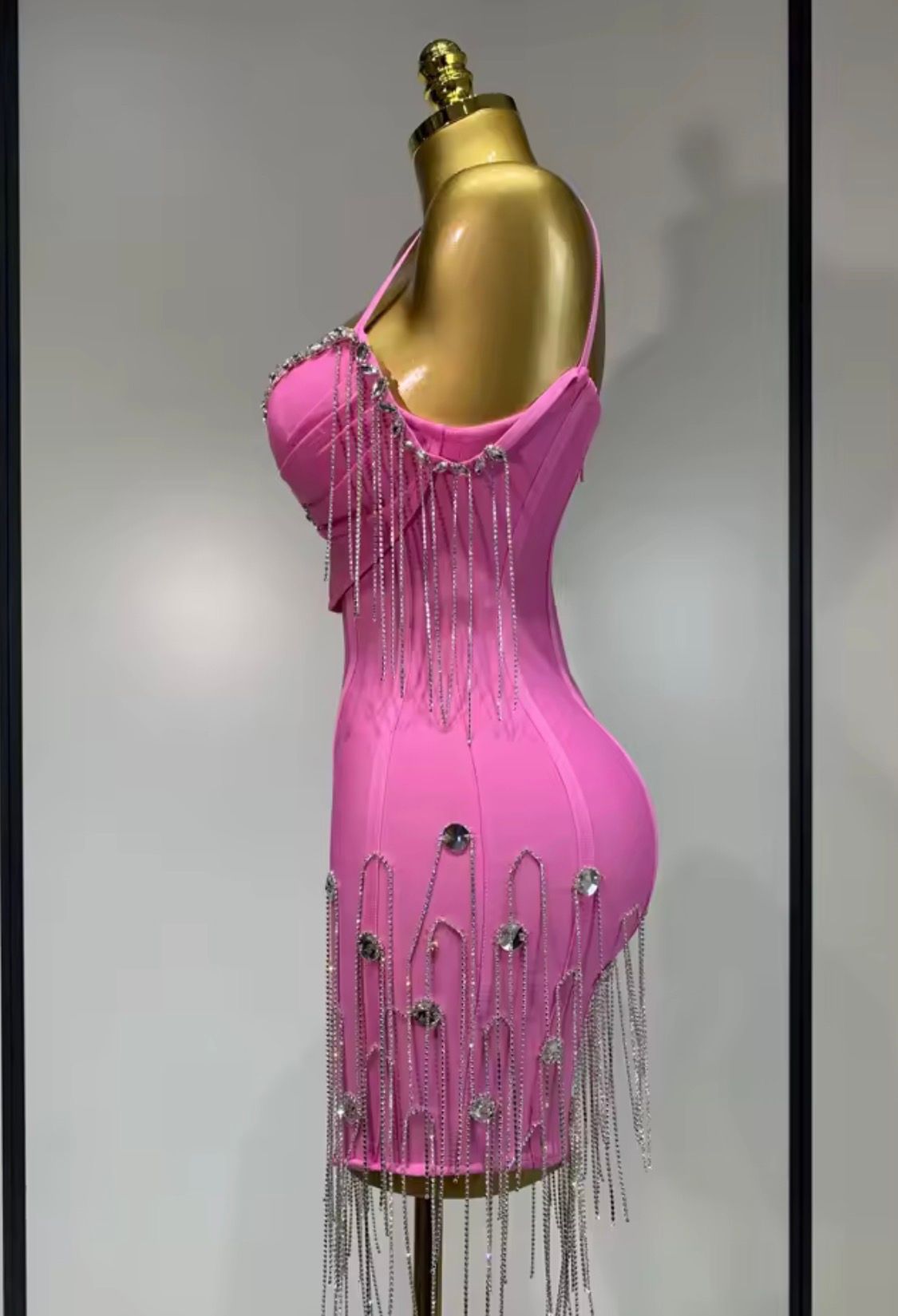 Vestido elástico bandage corto en color rosa fucsia con pedrería y flecos brillantes