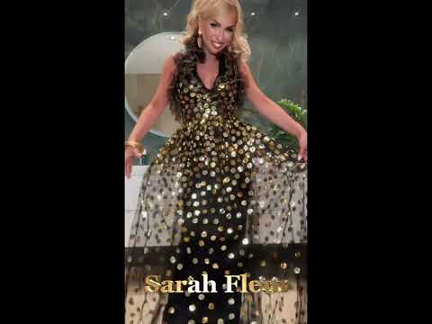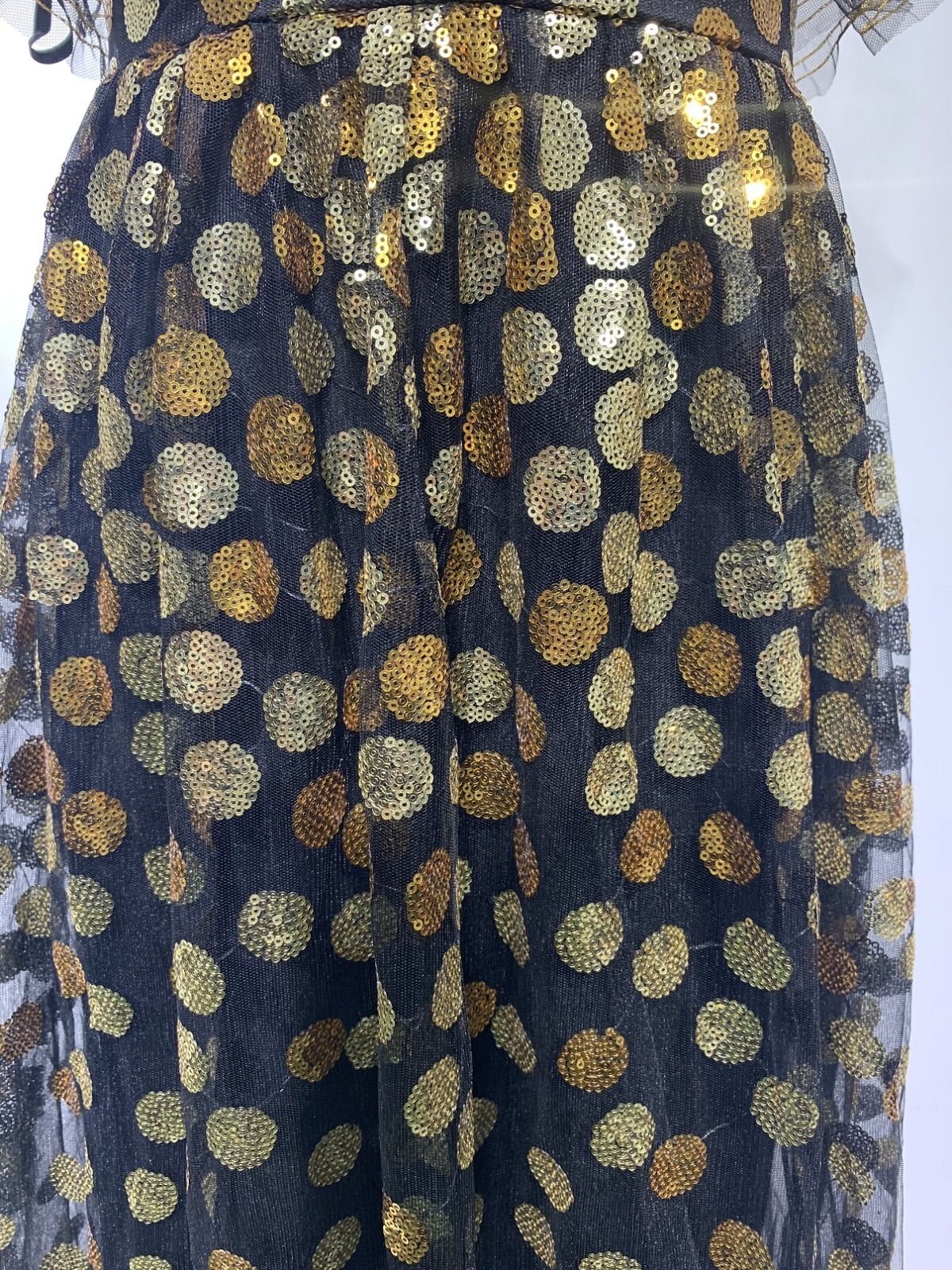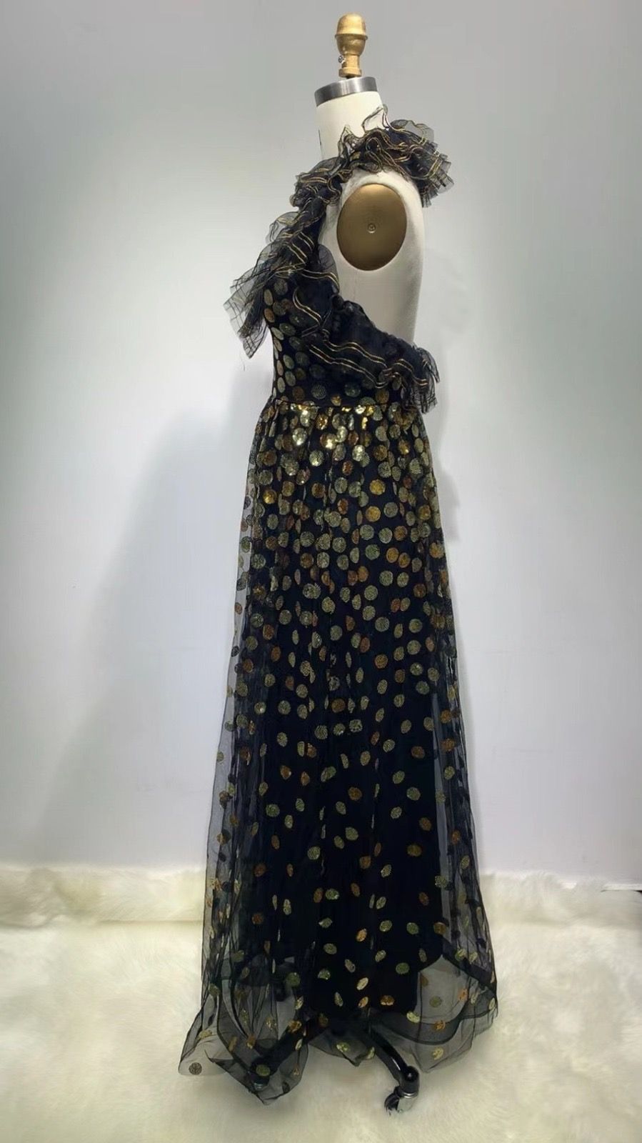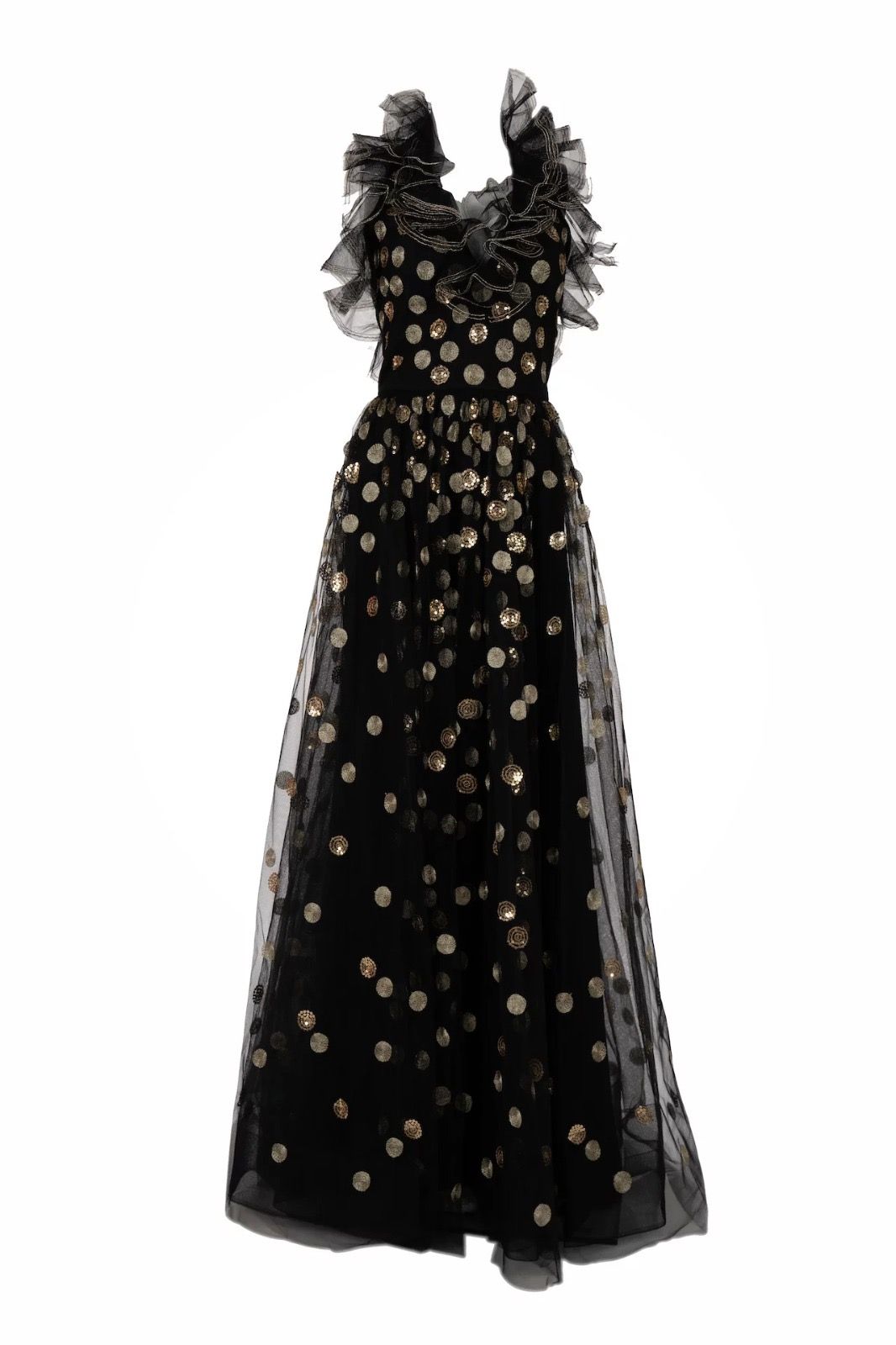 Vestido largo de tul negro con volantes y lunares dorados
