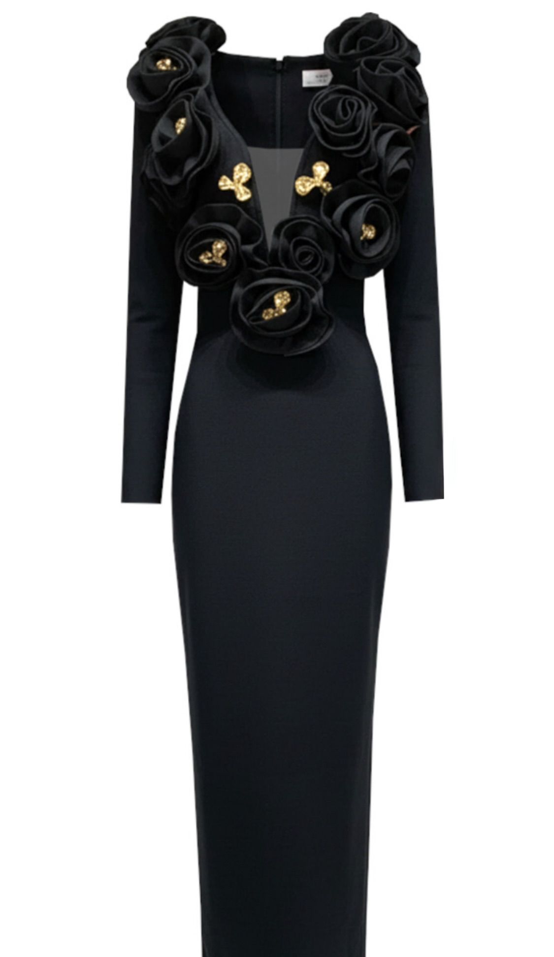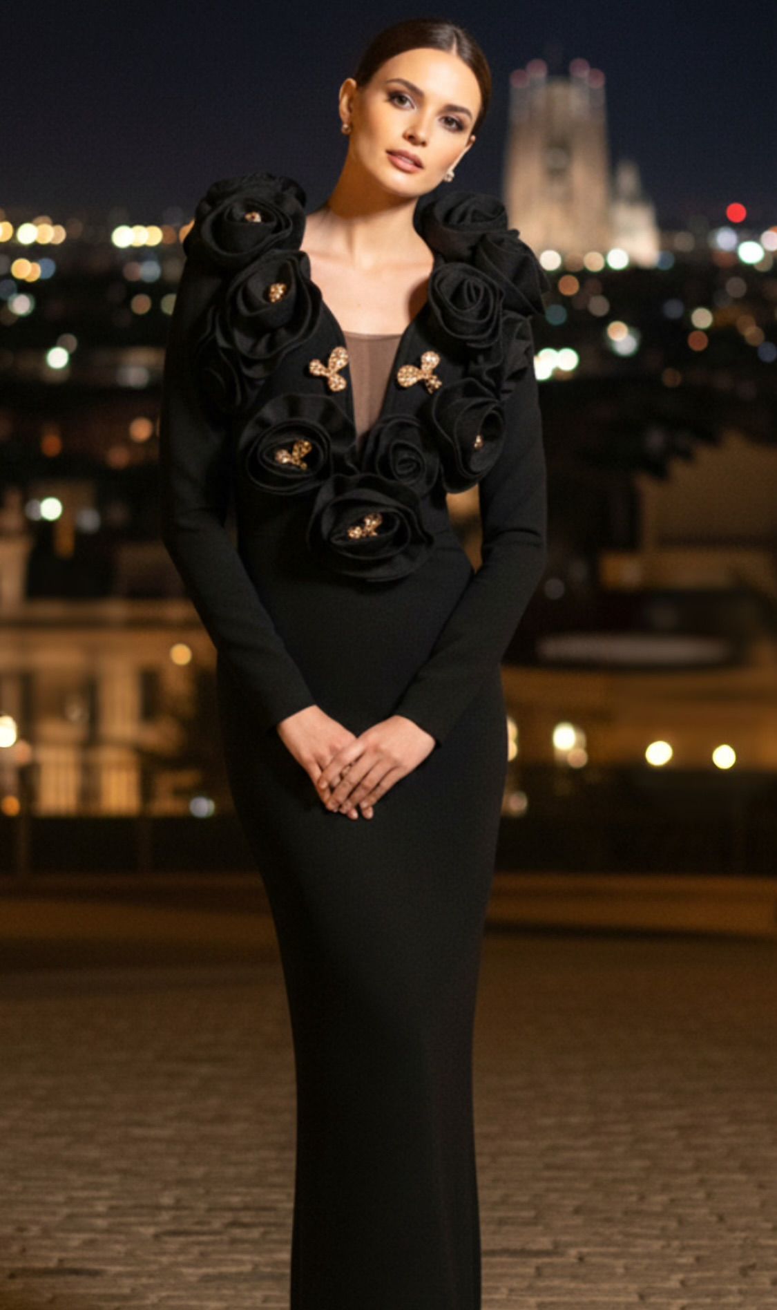 Vestido elástico de tejido bandage de manga larga con flores decorativas en negro